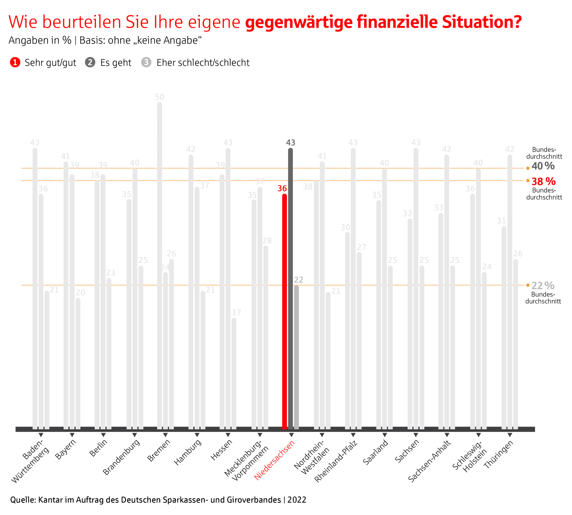 Steigende Preise für Lebensmittel und Energie sowie der Krieg in der Ukraine belasten die Menschen in Niedersachsen zunehmend. Das geht aus dem aktuellen Vermögensbarometer 2022 des Deutschen Sparkassen- und Giroverbandes (DSGV) hervor. Demnach beurteilen nur noch 36 Prozent der befragten Niedersachsen (n=300) ihre finanzielle Situation als sehr gut oder gut. Das ist nicht nur eine geringere Zufriedenheit als im Bundesdurchschnitt (38 Prozent), es ist auch ein klarer Rückgang im Vergleich zum Vorjahr. Trotz Corona-Pandemie beurteilte 2021 noch fast jeder zweite Niedersachse (44 Prozent) seine finanzielle Situation als sehr gut.