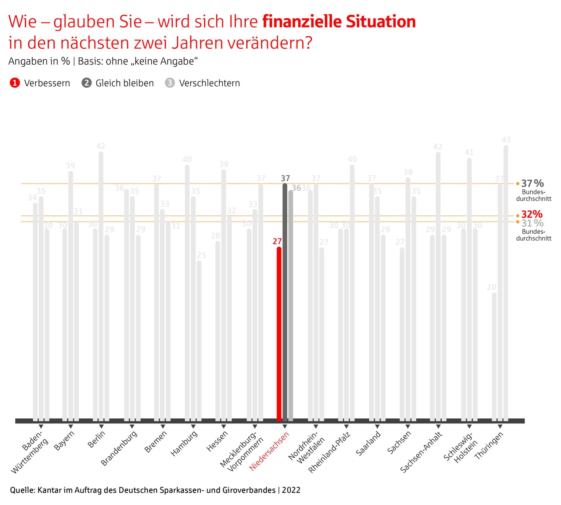 Auch der Blick in die Zukunft zeichnet sich deutlich düsterer. Glaubten 2021 noch 41 Prozent der Befragten in Niedersachsen daran, dass sich ihre finanzielle Situation in den nächsten zwei Jahren verbessern werde, sind es ein Jahr später nur noch 27 Prozent (Bundesdurchschnitt 32 Prozent). Gleichzeitig ist die Zahl derer, die pessimistisch in die Zukunft blicken, von 13 Prozent in 2021 (Bundesdurchschnitt 13 Prozent) sprunghaft auf 36 Prozent (Bundesdurchschnitt 37 Prozent) angestiegen.