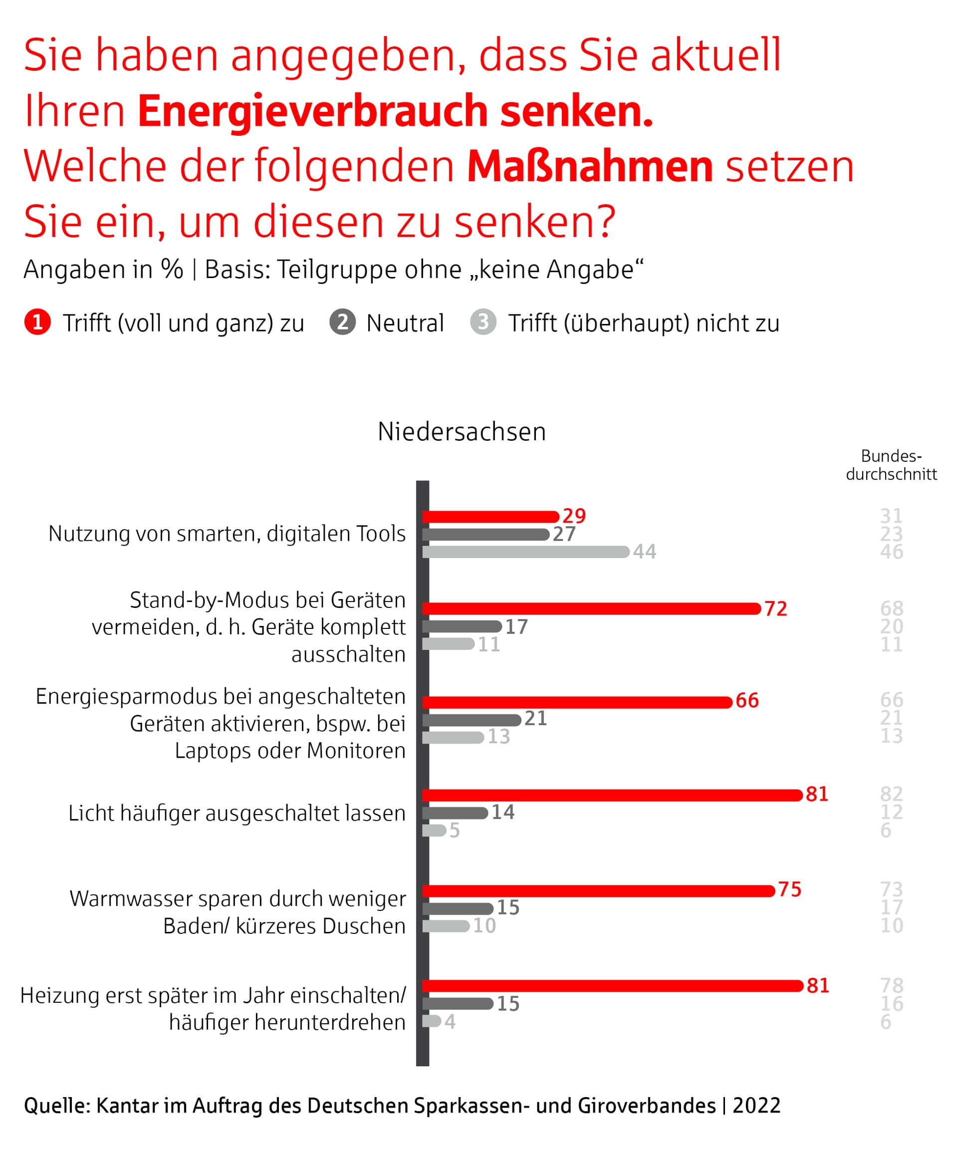 Auch die so oft kommunizierten Appelle zum Energiesparen werden in Niedersachsen den Umfrageergebnissen zufolge bereits großflächig umgesetzt. So schalten 81 Prozent der Niedersachsen ihre Heizung erst später ein (Bundesdurchschnitt 78 Prozent), bzw. regeln sie häufiger herunter und auch das Licht bleibt häufiger aus (Niedersachsen 81 Prozent; Bundesdurchschnitt 82 Prozent). Gleiches gilt für Elektrogeräte. Sie werden entweder ganz ausgeschaltet (Niedersachsen 72 Prozent; Bundesdurchschnitt 68 Prozent) oder im Energiesparmodus betrieben (jeweils 66 Prozent in Niedersachsen und im Bundesdurchschnitt). 75 Prozent der Befragten schränken sich zudem beim Baden und Duschen ein, um Warmwasser einzusparen (Bundesdurchschnitt 73 Prozent). Ausbaufähig ist hingegen sowohl in Niedersachsen als auch im Bundesdurchschnitt die Nutzung von smarten, digitalen Tools wie Heizungsthermostaten. 44 Prozent der Niedersachsen nutzen diese Lösung bisher noch gar nicht, um Energie einzusparen. Damit verhalten sich die Niedersachsen wie der Bundesdurchschnitt (46 Prozent).