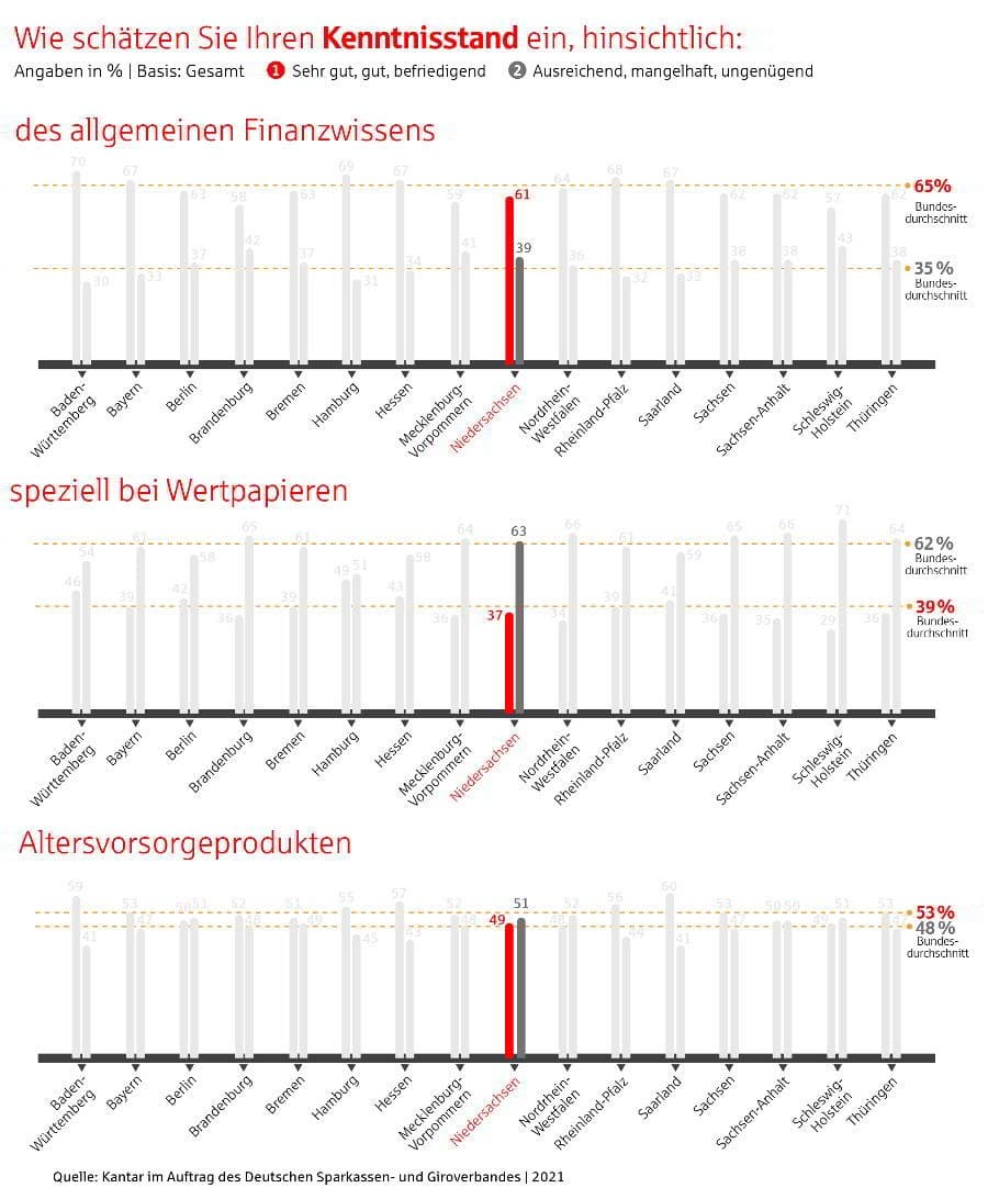Schwächen offenbaren die Niedersachsen beim Finanzwissen. Zwar geben 61 Prozent der Befragten ihr allgemeines Finanzwissen mit den Schulnoten „sehr gut bis befriedigend“ an, gleichzeitig bewertet ein fast genauso großer Anteil der Befragten (63 Prozent) ihr Finanzwissen bei Wertpapieren jedoch nur als ausreichend bis ungenügend. Auch bei Altersvorsorgeprodukten gibt jeder zweite Befragte (51 Prozent) an, nur ausreichende bis ungenügende Kenntnisse zu haben. Thomas Mang: „Die Menschen müssen selbstbestimmt über ihre Möglichkeiten beim Vermögensaufbau und der Altersvorsorge entscheiden. Das geht nur mit einem umfassenden Finanzwissen. Hier stehen die Sparkassen ihren Kundinnen und Kunden natürlich beratend zur Seite.“