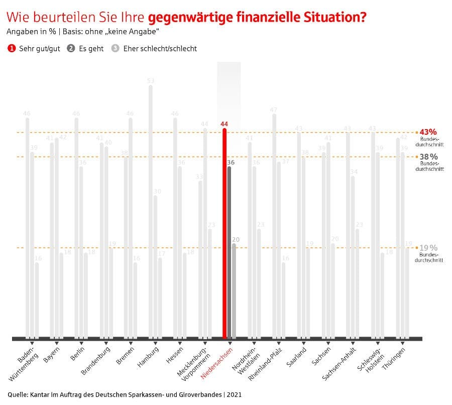 Trotz anhaltender Corona-Krise beurteilen 44 Prozent der Menschen in Niedersachsen ihre finanzielle Situation als sehr gut oder gut und sind damit etwas zufriedener als der Bundesdurchschnitt (43 Prozent). Das geht aus dem Vermögensbarometer 2021 des Deutschen Sparkassen- und Giroverbandes (DSGV) hervor. 41 Prozent der Befragten in Niederachsen (n=300) glauben sogar, dass sich ihre finanzielle Situation in den nächsten zwei Jahren verbessern wird. Damit blicken die Niedersachsen überdurchschnittlich optimistisch in die Zukunft (Bundesdurchschnitt 37 Prozent). Trotz der positiven Einschätzung ihrer finanziellen Situation legen die Menschen in Niedersachsen weiterhin Geld für schlechte Zeiten beiseite. 24 Prozent der Befragten sparen infolge der Corona-Krise mehr oder planen dies zumindest.