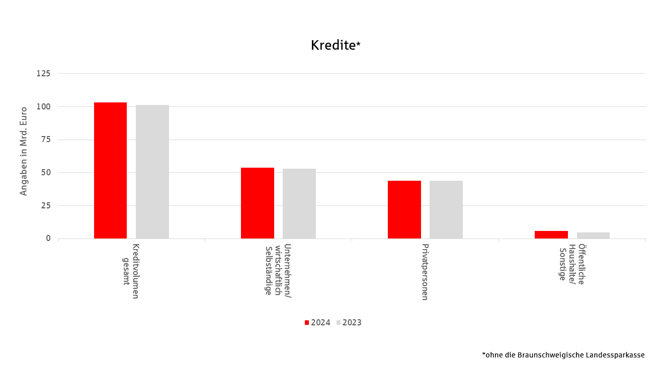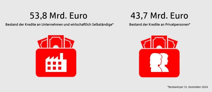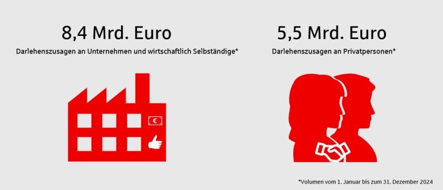 Die Darlehenszusagen an Privatpersonen sowie Unternehmen und Selbstständige lagen 2024 bei insgesamt 13,9 Mrd. Euro. So konnten die niedersächsischen Sparkassen einen Anstieg von rund 1,6 Mrd. Euro erzielen und bleiben damit sowohl für die örtlichen mittelständischen Unternehmen als auch für die Privatkunden in ihren Geschäftsgebieten wichtigster Kreditgeber.